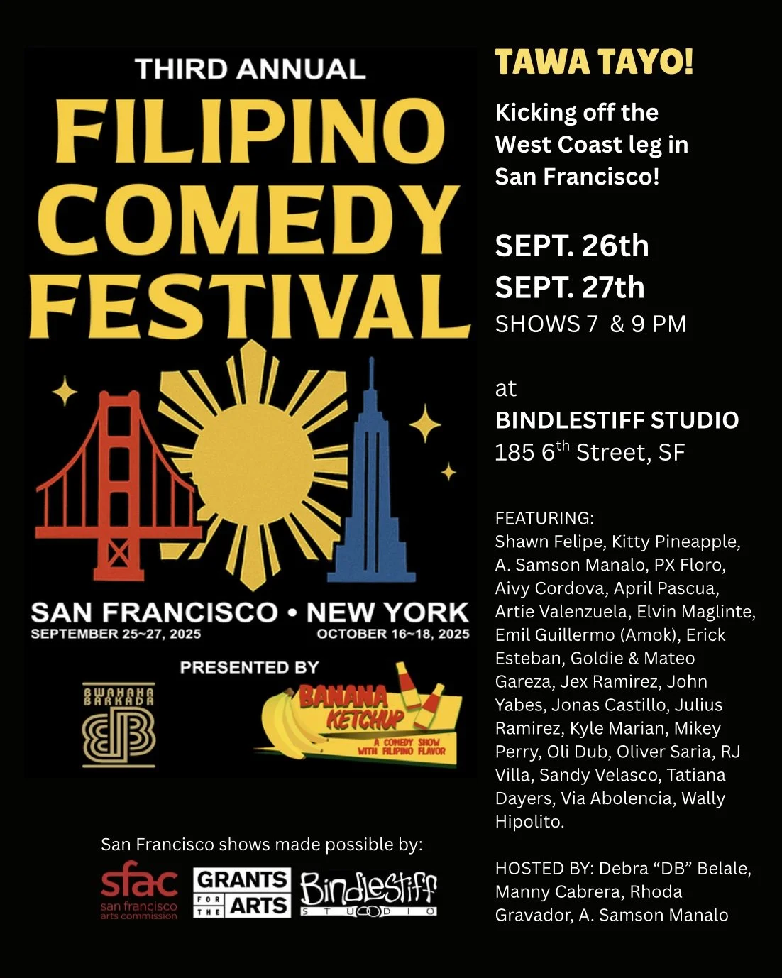 October is nationally recognized as Filipino American History Month, a time to celebrate the profound history, resilience, and cultural contributions of the Filipino community in the United States. This year, the celebration starts early (early? yes, early!) with the highly anticipated return of the Filipino Comedy Festival, launching its West Coast leg at San Francisco’s Bindlestiff Studio on Friday, September 26 and Saturday, September 27.